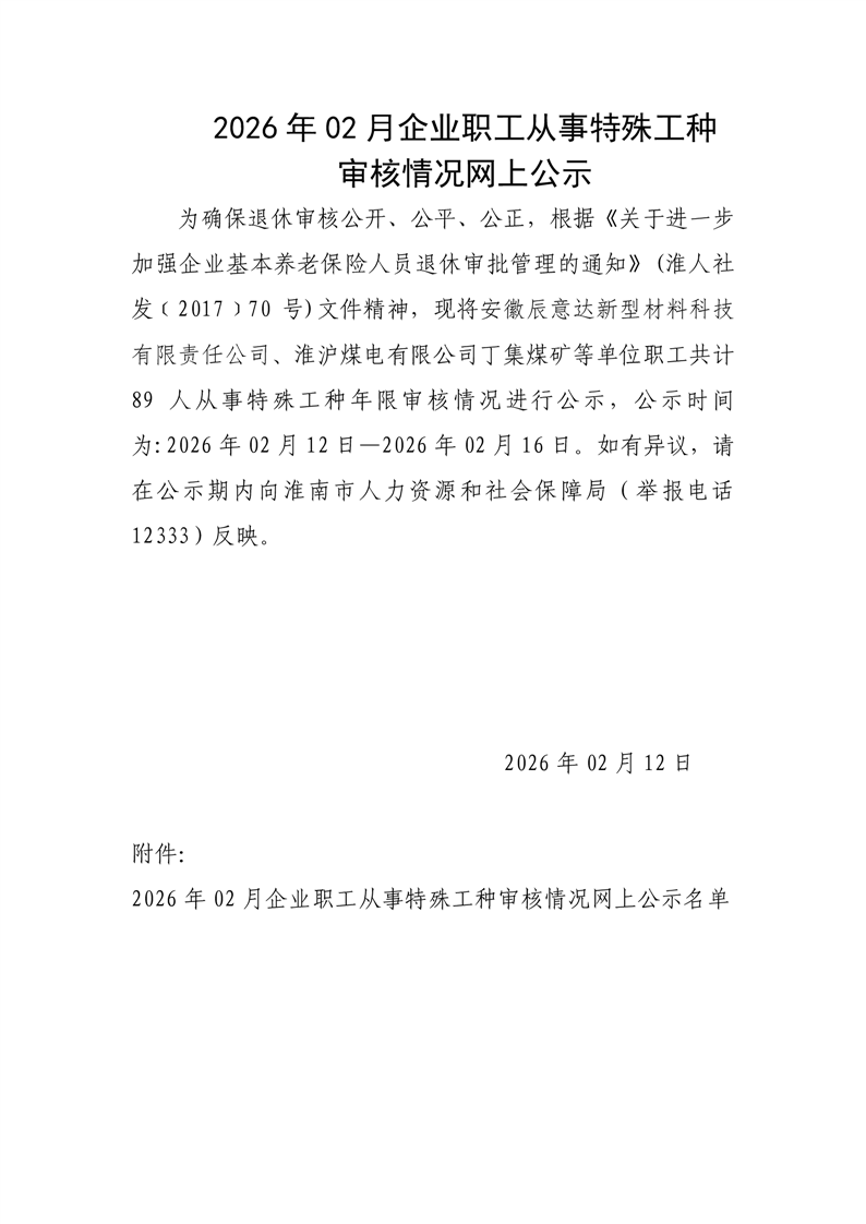 2026年02月企业职工从事特殊工种审核情况网上公示
