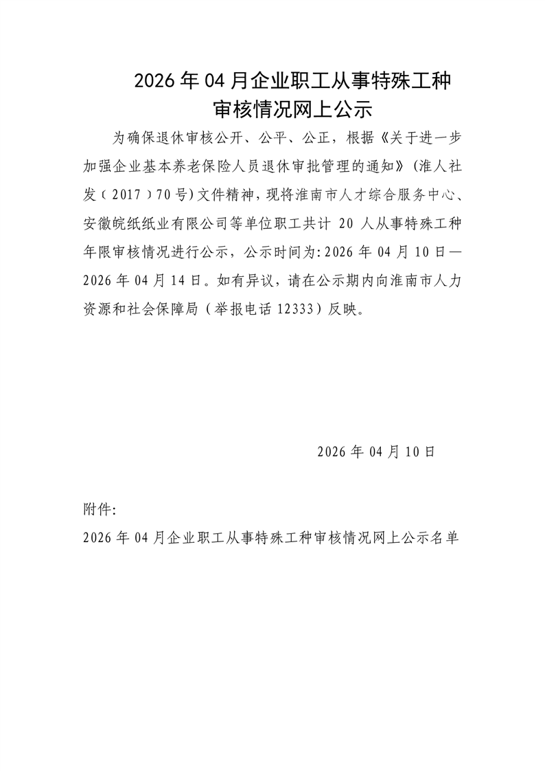2026年04月企业职工从事特殊工种审核情况网上公示