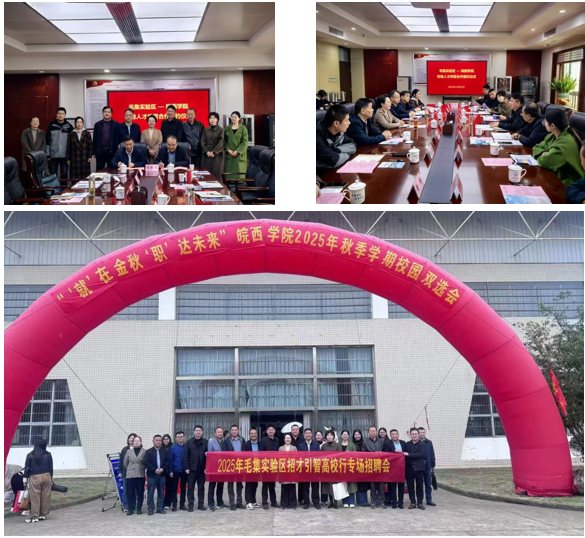2025年10月25日,毛集实验区“招才引智高校行”系列活动在皖西学院顺利举办。本次活动采取“座谈交流+现场双选”相结合的模式,由区管委副主任王德奖带队,区人社局、园区办等部门负责人协同参与,并汇聚区内12家重点企业代表共同走进校园。