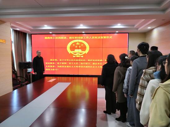 12月6日,市人社局组织2023年新进、新任职国家工作人员进行宪法集体宣誓活动。宣誓仪式由市人社局党组成员、副局长张新辉同志监誓,工伤保险科科长贾健同志领诵誓词,其余宣誓人跟诵誓词。