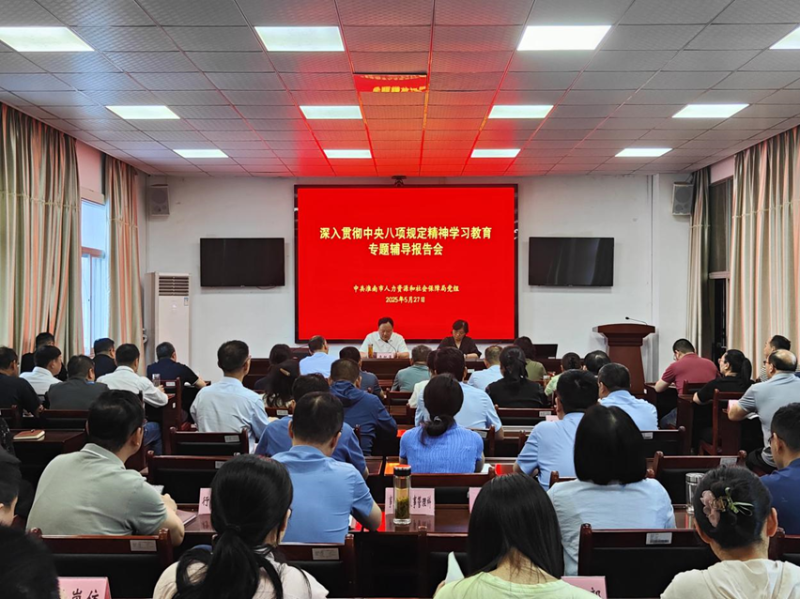 5月27日下午,市人社局举行深入贯彻中央八项规定精神学习教育专题辅导报告会,邀请市纪委常委、市监委委员楼晶吉作专题辅导。局党组书记、局长李艳景主持并讲话,局机关全体人员,各党支部班子成员和局年轻干部、关键岗位干部、新提拔干部代表参会。