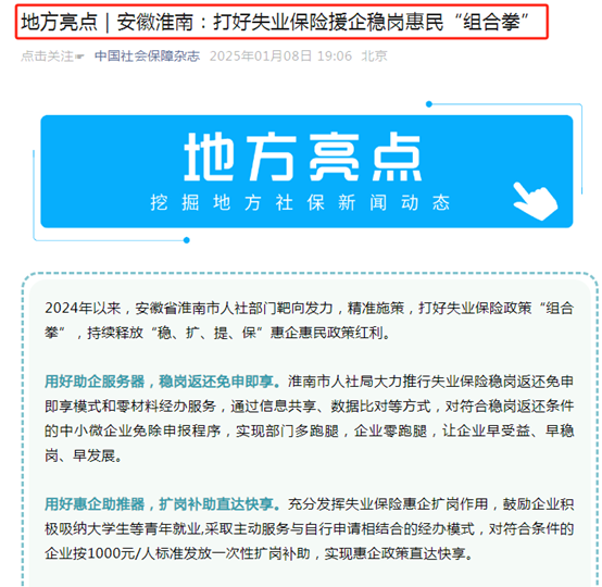 来源:2025年1月9日,中国社会保障杂志《地方亮点|安徽淮南:打好失业保险援企稳岗惠民“组合拳”》