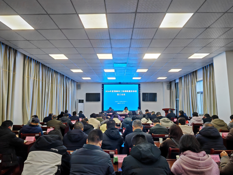 2026年1月27日,淮南市2026年工伤保险服务协议签订会议在金海大厦召开。市人社局二级调研员童立美出席会议并作重要讲话,市工伤保险管理中心、淮南矿业集团员工保障服务中心、中国人民健康保险淮南分公司相关负责人,以及全市33家协议机构代表参会,共同完成年度服务协议签订。