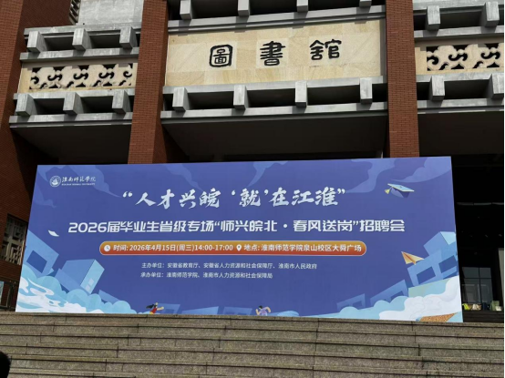 春暖四月,智汇舜耕。4月15日,由淮南师范学院、淮南市人力资源和社会保障局承办的2026届毕业生省级专场“师兴皖北·春风送岗”招聘会在淮南师范学院温暖启幕。本次活动以“人才兴皖,‘就’在江淮”为主题,变“坐等上门”为“主动送岗”,将城市发展的机遇与诚意带到毕业生身边。